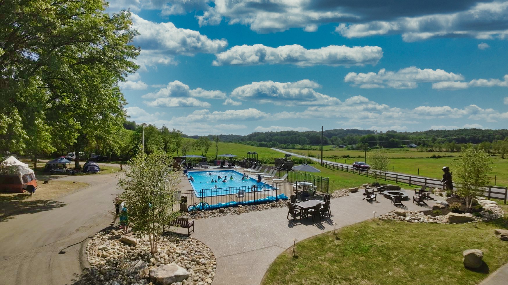 A top-rated Pennsylvania family park on the border of beautiful Moraine State Park's hiking area. Easy access to Porter Cove at Lake Arthur. Just 35 minutes to Pittsburgh . RVing, Tenting, Cabins, Canoes, Kayaks, Pool, Playground, Arcade, Camp Store, Concessions, Modern Restrooms, Showers, Fishing, Ball-fields, Rec-Center, TV Room, Fireplace, and Lodge.