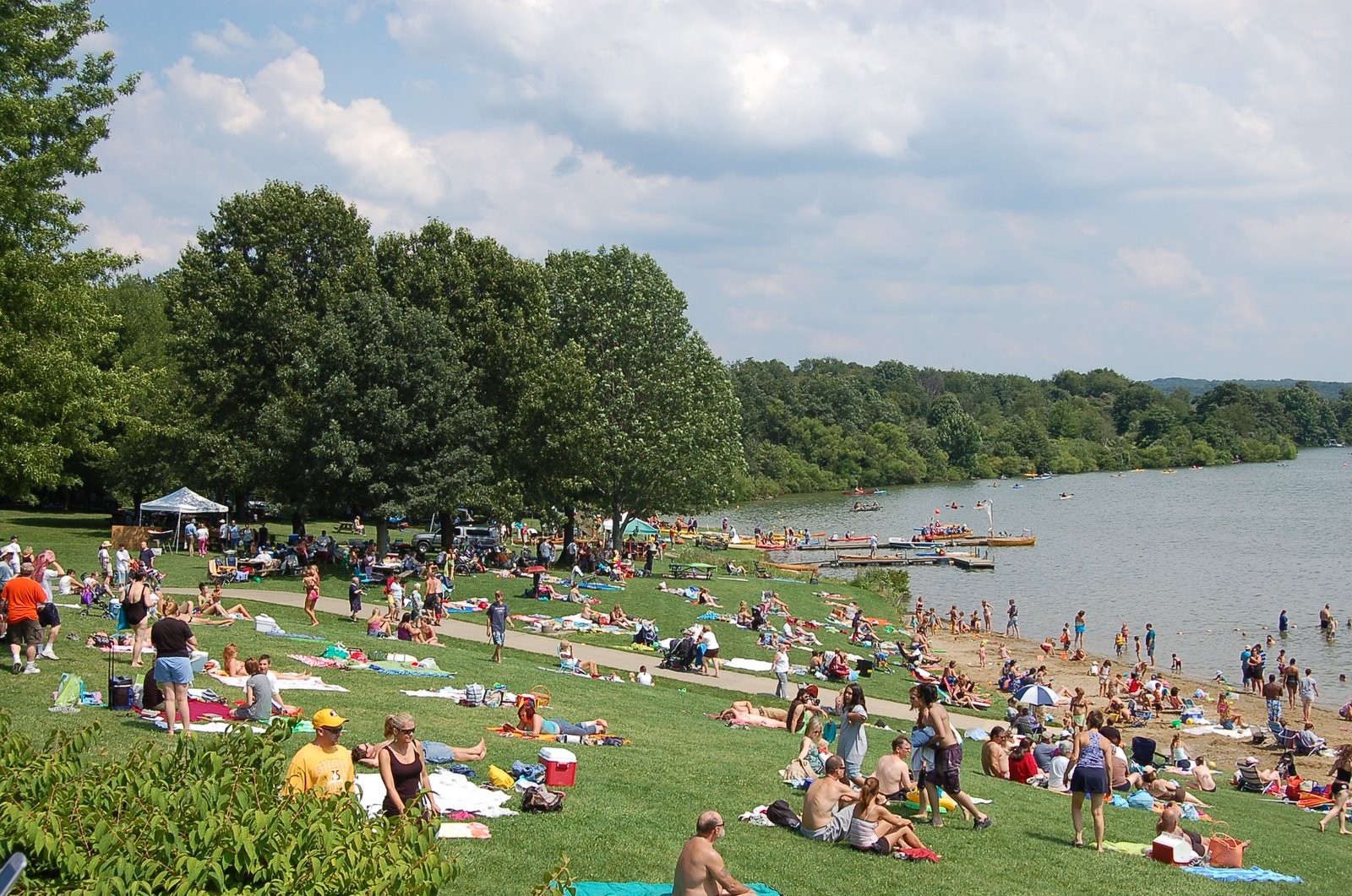 Swimming: Swimming is permitted at two beaches along the shore of Lake Arthur. The Pleasant Valley Beach on the South Shore is a 1,200-foot turf and sand beach and has a paved path into the water. A sand volleyball court and playground are on the west side of the beach. Lakeview Beach on the North Shore is a 550-foot sand beach. The beaches are open daily from Memorial Day Weekend to Labor Day unless otherwise posted. The regular hours are sunrise to sunset. Swim at your own risk. Showers, changing facilities and snack bars are available at both beaches. To keep these areas clean and safe, pets are prohibited in the beach areas.