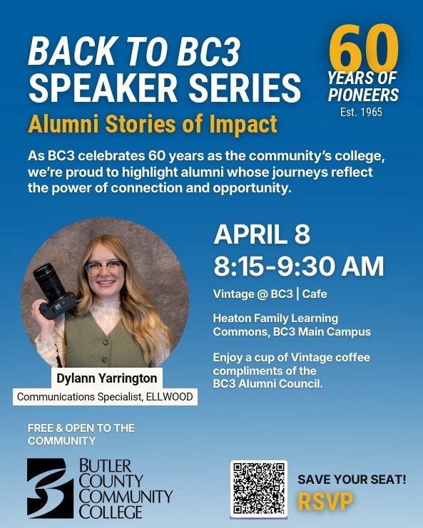 You’re invited to join us for our next Back to BC3 Speaker Series: Alumni Stories of Impact, presented by the BC3 Alumni Association and part of BC3’s 60th Anniversary Celebration & Campaign. This series was created to celebrate meaningful alumni journeys while bringing together our campus community, leaders, professionals, and supporters for connection and conversation.