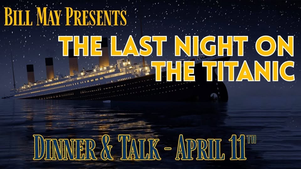 Enjoy a Titanic-inspired First Class dinner, served on antique china and modeled after the actual menu enjoyed just hours before tragedy struck on April 15, 1912. Live musicians on stage from the BHS Rock Orchestra will perform authentic 1912-era music, setting the tone for an immersive, candlelit voyage. Pose for photos on the bow of the ship and capture a moment straight from history. Then be captivated as Bill May presents “The Lost Faces of the Titanic”, revealing the true stories behind the passengers—many you’ll recognize from the film Titanic—and countless others whose lives were forever changed that night.