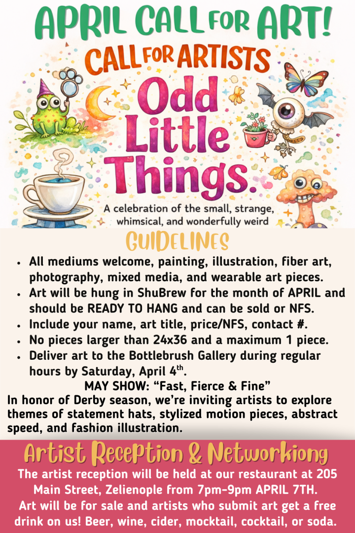 ShuBrew is inviting artists to submit work for our April art show, Odd Little Things! This show celebrates the quirky details of life — the odd, charming, curious little moments that make the world more interesting.