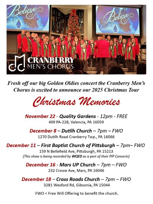 Fresh off our big Golden Oldies concert, the Cranberry Men's Chorus is excited to announce our 2025 Christmas Tour!