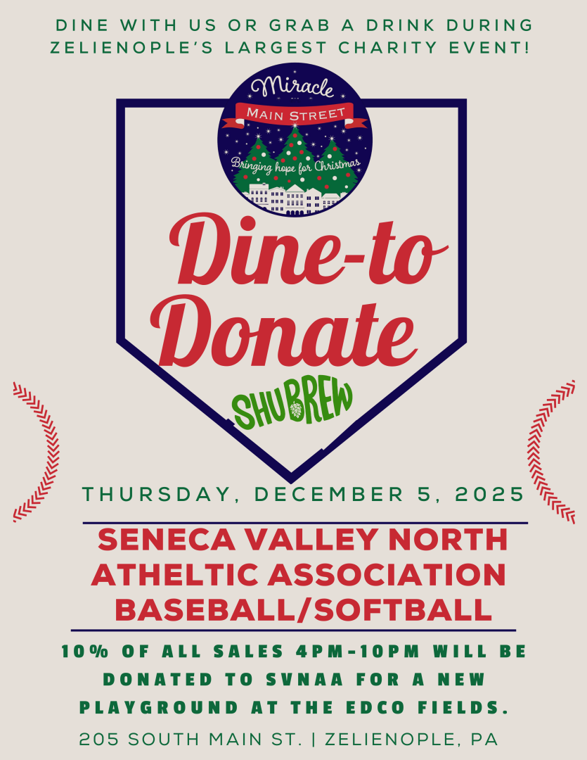 This year, we are working with Seneca Valley North Athletic Association for a dine-to-donate event to raise funds for a new playground at the Evans City baseball and softball fields. The old playground had to be torn down this year and we are hoping to get a new one up for the Spring 2026 season. Dine or get takeout from ShuBrew between 4pm-10pm and we will donate 10% of sales to SVNAA specifically for the playground project.
