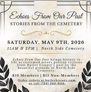 With new stories every year, Echoes From Our Past brings history to life as costumed actors portray citizens from Butler on the beautiful grounds of North Side Cemetery. The event will be held rain or shine (we will reschedule for severe weather).