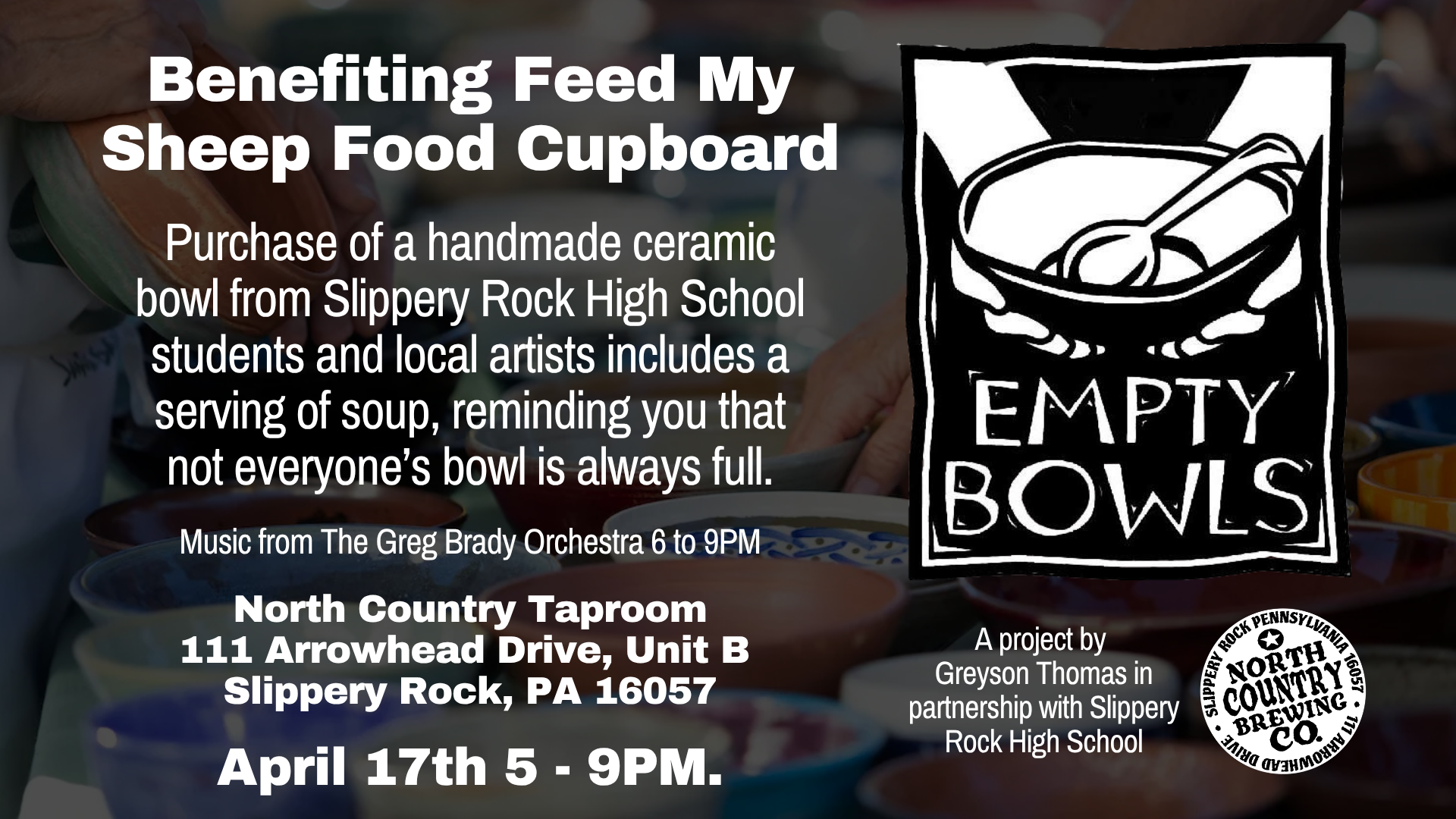 At this event, guests purchase a handmade ceramic bowl created by Slippery Rock High School students and local artists, filled with soup to enjoy. The bowl is yours to keep—serving as a reminder that not everyone’s bowl is full.