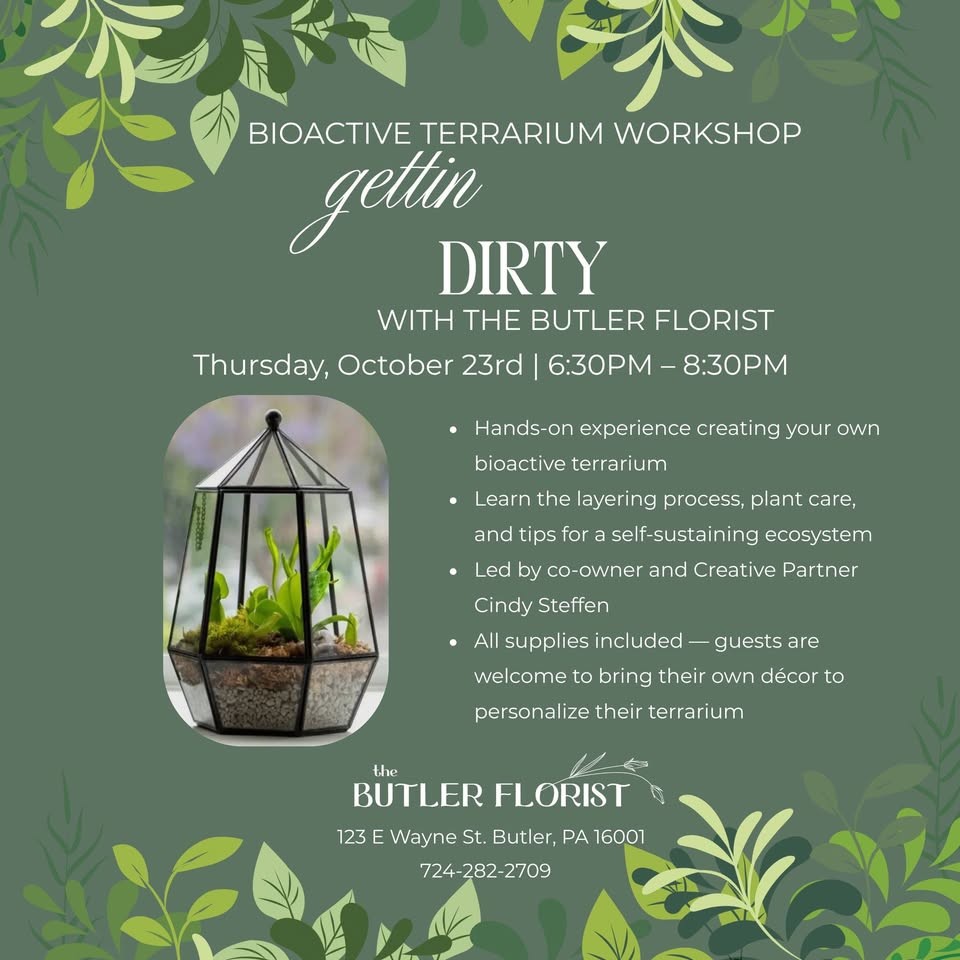 Join us on Thursday, October 23rd from 6:30–8:30 PM for a hands-on workshop where you’ll create your very own bioactive terrarium. Learn the layering process, plant care, and tips for building a self-sustaining ecosystem — guided by our co-owner and Creative Partner, Cindy Steffen.