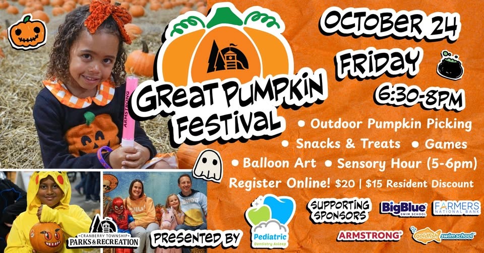 Many thanks to Pediatric Asleep Dentistry, Armstrong, Big Blue Swim School, Farmers National Bank, and Goldfish Swim School - Wexford for sponsoring the 2025 Great Pumpkin Festival!