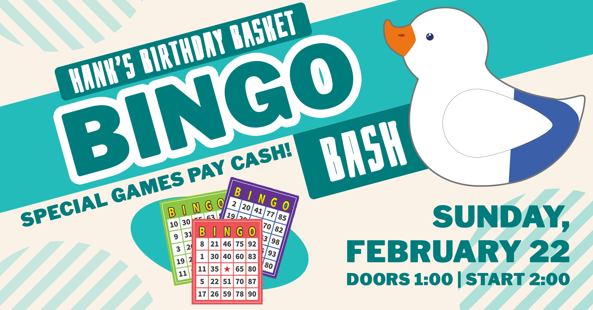 Help us celebrate a very special milestone: Hank the duck is turning 3! To honor our sweet special needs boy, we’re hosting Hank’s Birthday Basket Bingo Bash, a fundraiser benefiting the animals at J and J Farms Animal Sanctuary. Tickets are $20 in advance or $25 at the door, and include 9 regular bingo games of 6 cards, each, and desserts. Need more chances to win? Extra bingo books are just $10.