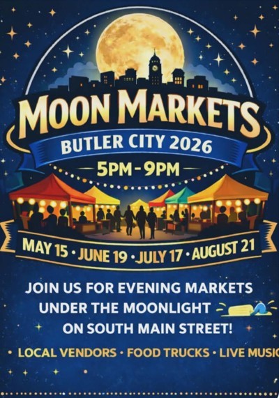 Join us on Main Street in Butler PA for Moon Markets Butler City!! Shop and have fun under the stars at this amazing Night Market This is a curated mix of unique Artisans and vendors! You can also enjoy the shops, restaurants and bars on Main Street who will remain open to greet you! Moon Markets Butler City will be held in conjunction with Foodie Fridays, another great event on Main Street!!
