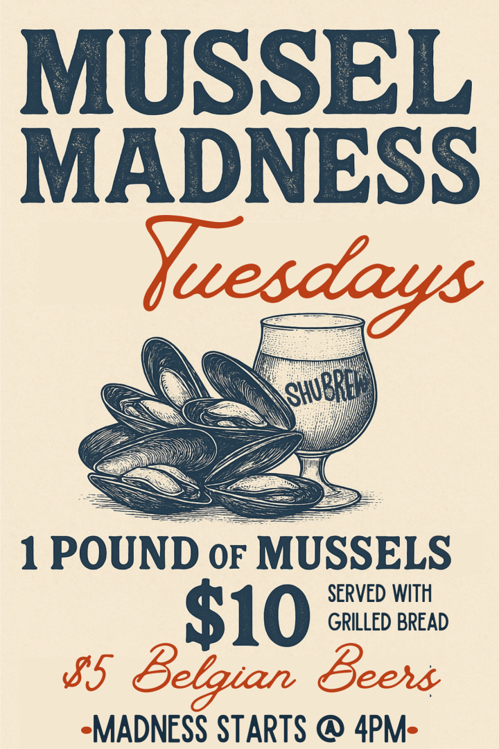 Every Tuesday starting at 4pm, dig into a pound of mussels served with sauce and grilled bread for just $10. Pair it perfectly with one of our rotating Belgian beers — only $5 each!