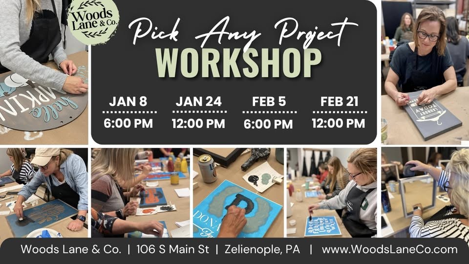 Choose any DIY project from the Creative Studio menu to complete on one of these Public Workshop dates! A wood sign, door hanger, porch sign - whatever you want!