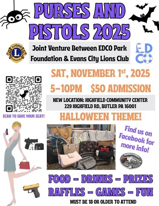 Come support EDCO Park and the Evans City Lions Club at our Halloween-themed fundraiser on Friday, Nov. 1st at Highfield Hall in Butler!