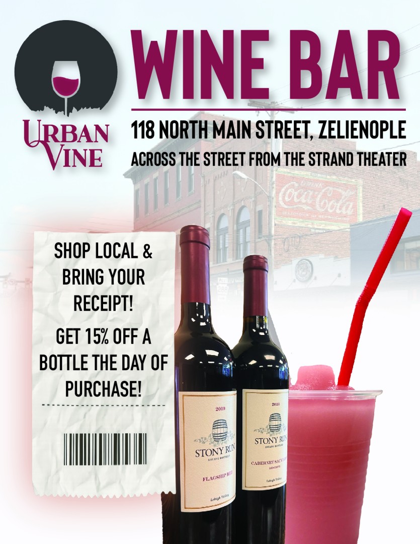 Shop local, bring in a receipt from any Zelienople business to receive 15% OFF A BOTTLE OF WINE. 1 per customer.