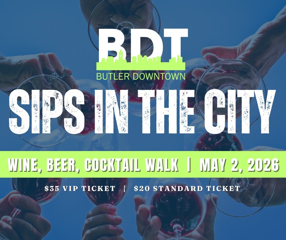 The 4rd Annual Sips in the City, presented by Butler Downtown will be on Saturday, May 2nd from 1 PM- 4 PM. Tickets are on sale now, preordering tickets is recommended.